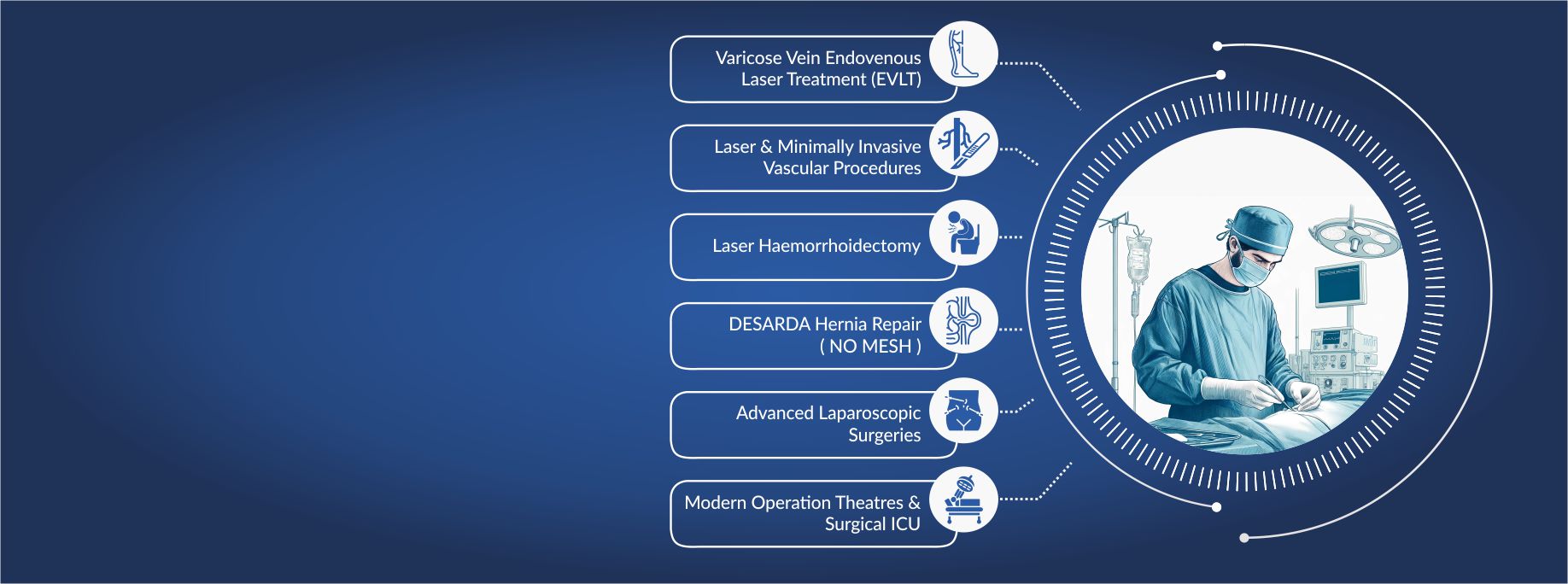 Our expert surgeons are trained in laparoscopic (keyhole) procedures and vascular interventions, supported by modern operation theatres, precision imaging systems, and enhanced post-operative care. These procedures are not only safer and quicker compared to traditional open surgeries but also lead to shorter hospital stays and lower chances of complications, making them ideal for patients of all age groups.